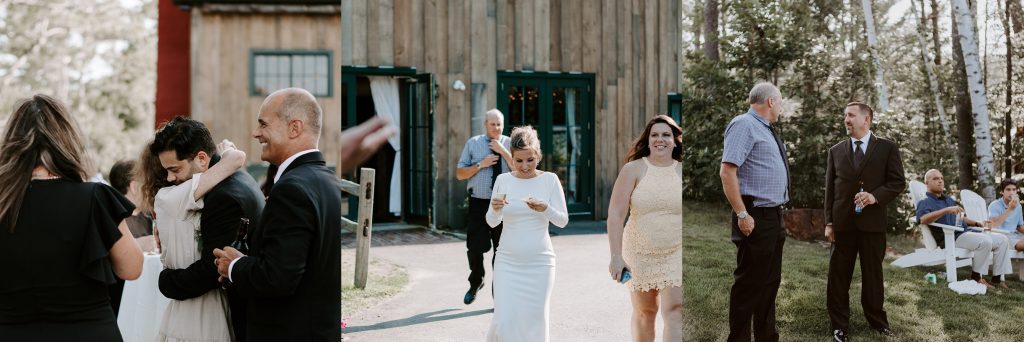 Cocktail hour took place outside, giving guests the chance to enjoy the fresh air and scenic surroundings that make this New Hampshire mountain wedding venue so special. One of the most talked-about features in reviews of The Barn on the Pemi is the outdoor experience. Couples and guests love how the day flows between spaces, especially during cocktail hour.