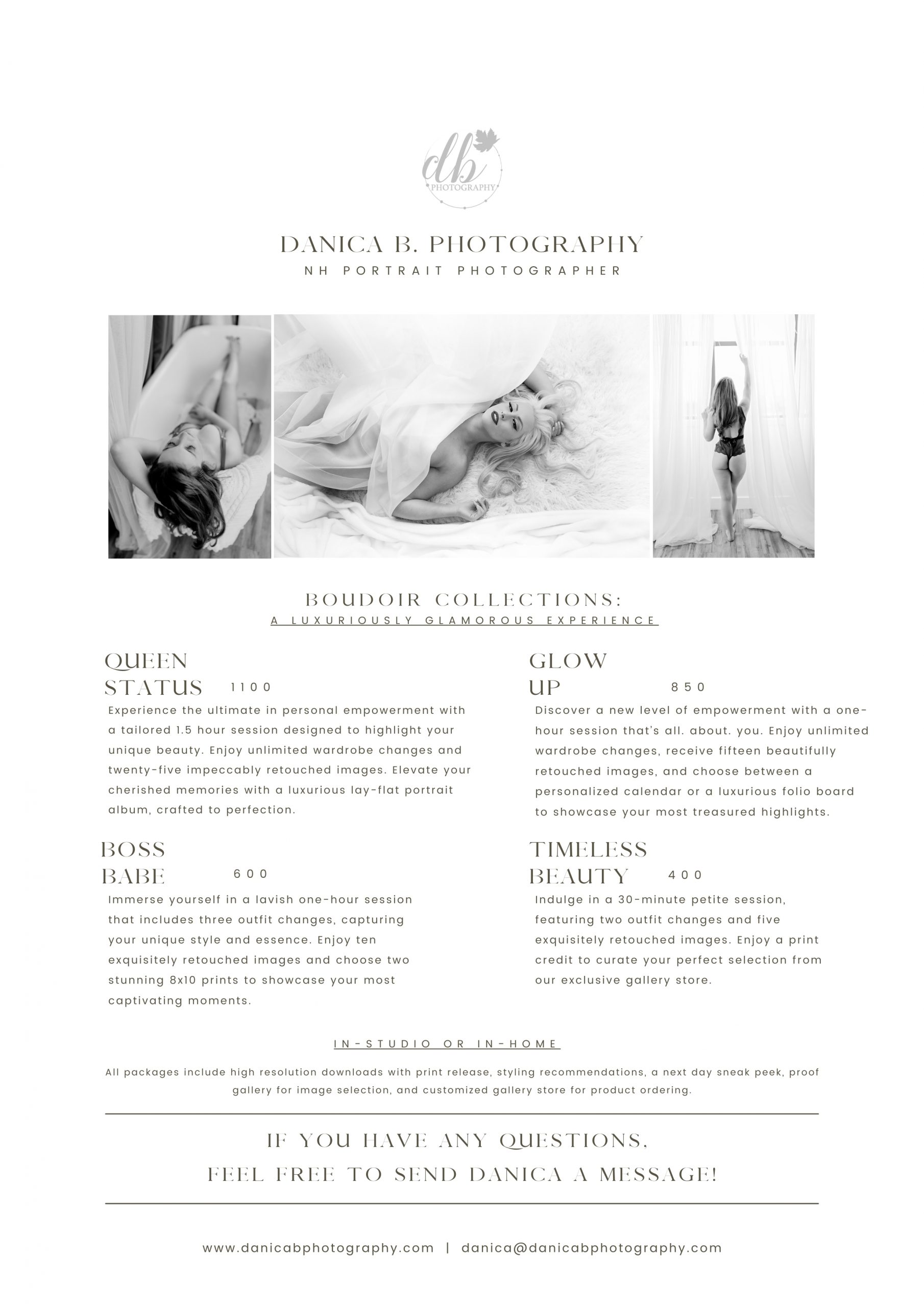 In our Concord, NH studio, every detail — from the curated props to the styled sets — comes together to leave you feeling empowered and radiant.